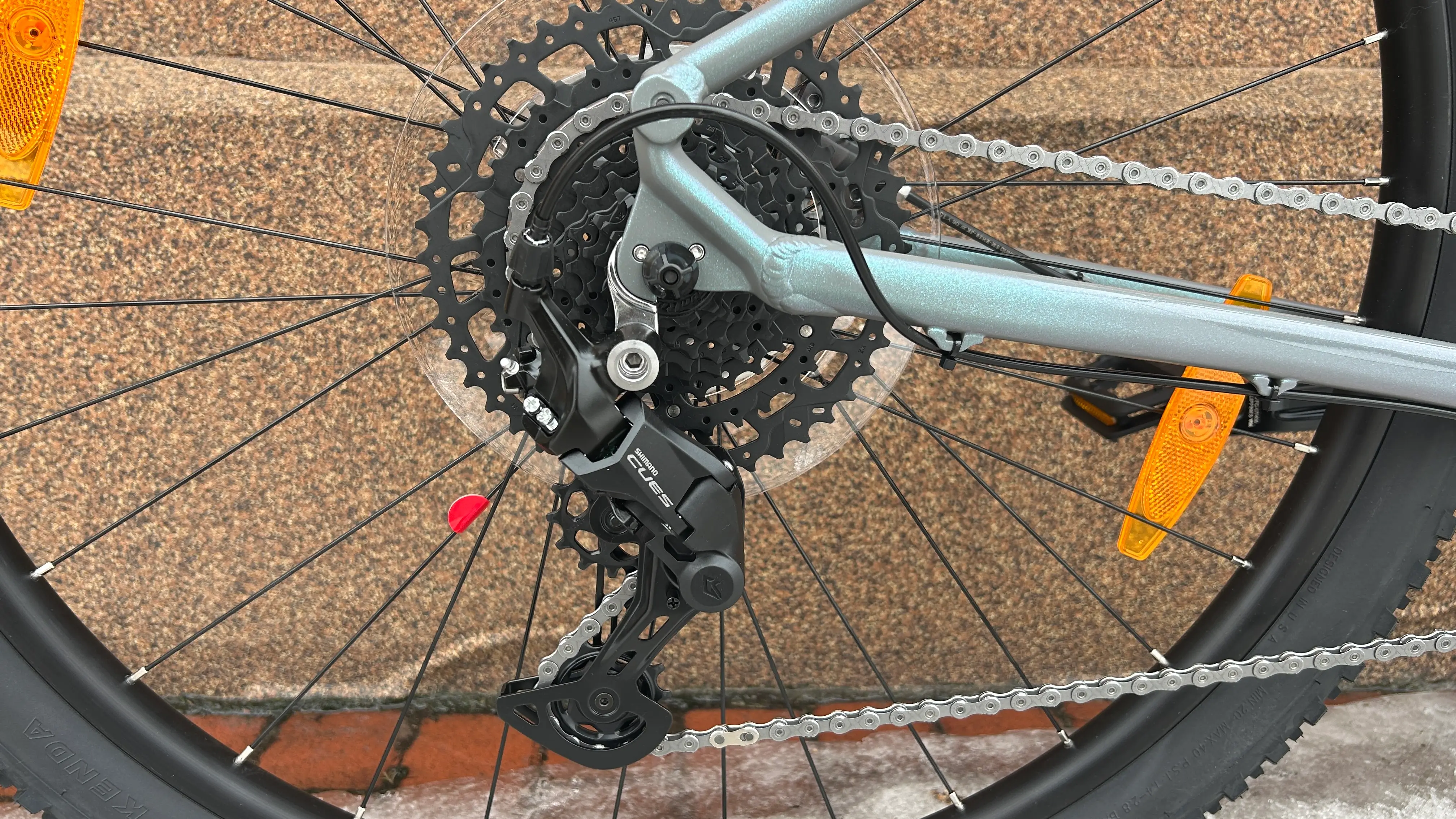 Трансмиссия построена на компонентах Shimano CUES U4000 в конфигурации 1×9. Впереди установлены шатуны Shimano Cues UT400-1 с одной звездой на 32 зубца в сочетании с кареткой Shimano UN101 LL123. Сзади используется кассета SunRace U9 CS-U980 с диапазоном 11–46Т и цепь KMC xGlide. Переключение обеспечивает задний переключатель и шифтер Shimano Cues U4000.